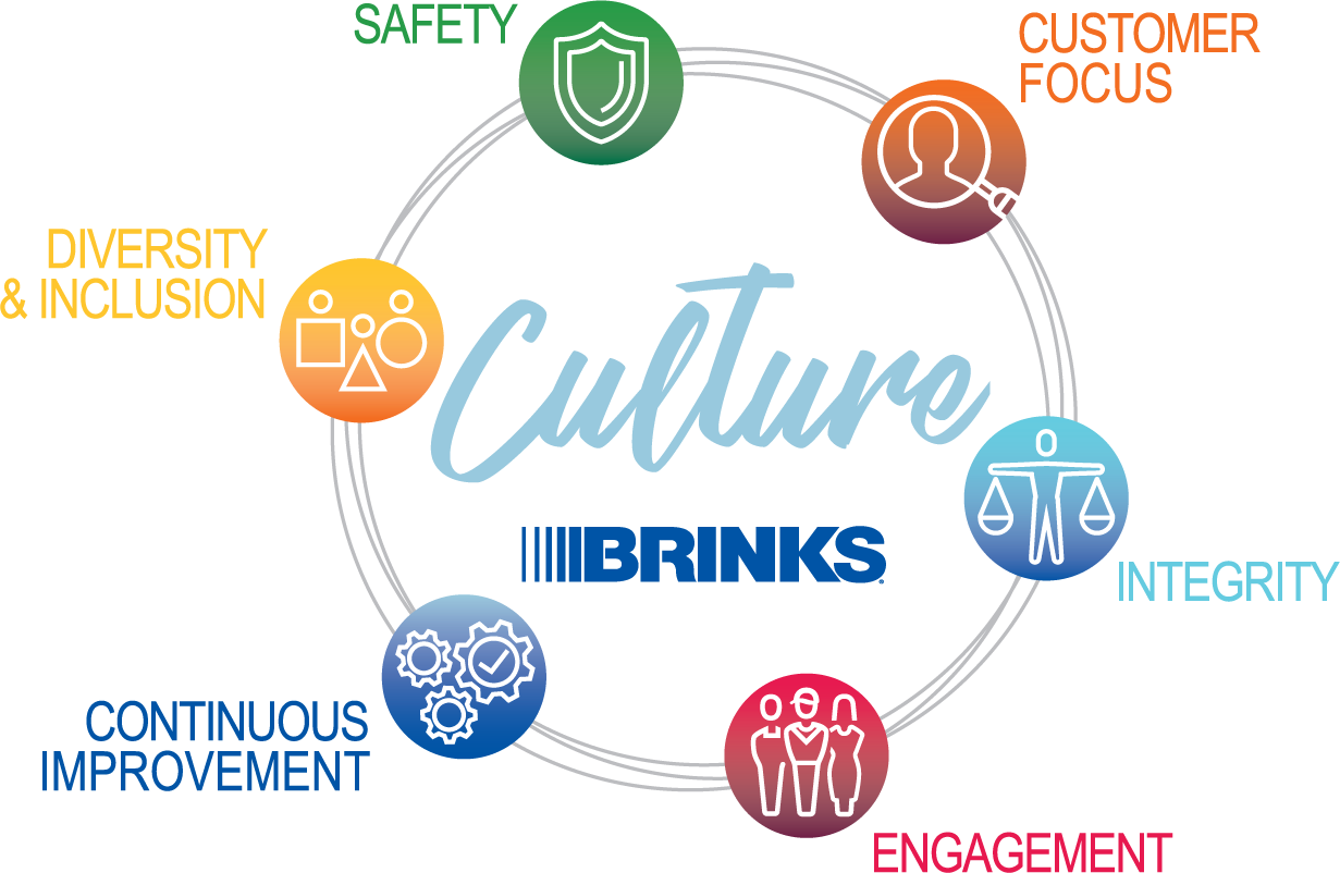 At Brink’s, living our values of Safety, Customer Focus, Integrity, Engagement and Continuous Improvement every day makes a difference for our employees and our customers. Our values ensure that we work safely to protect ourselves and others, offer successful solutions, always display the highest standards of ethics, and use technology to achieve results.